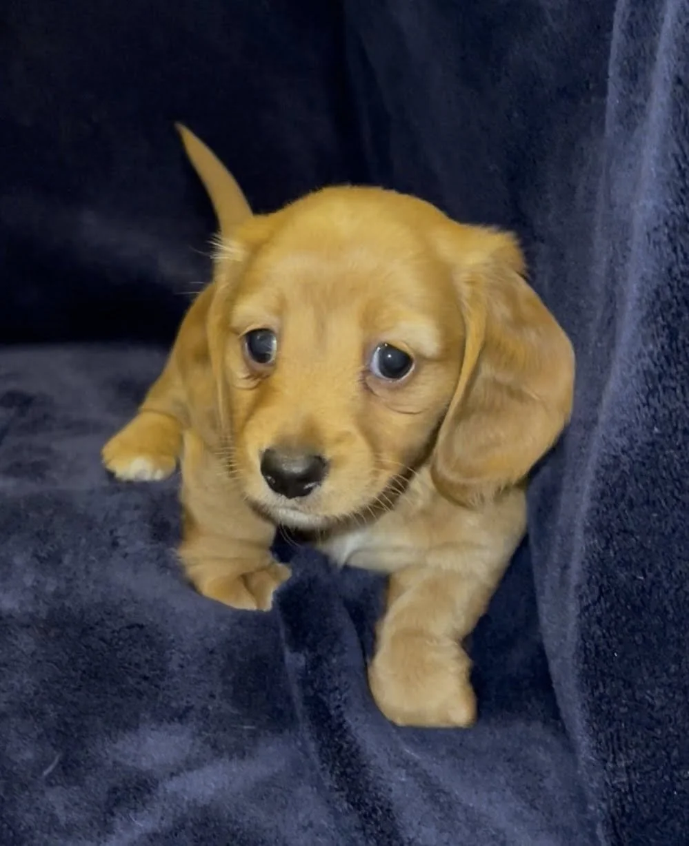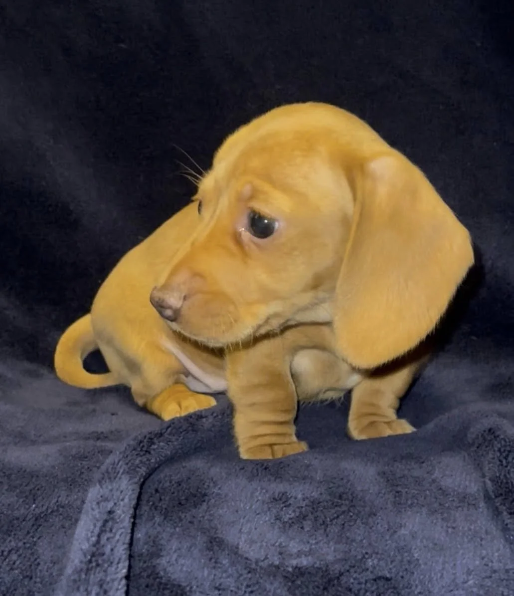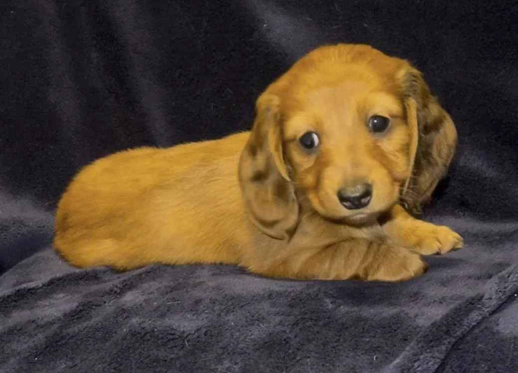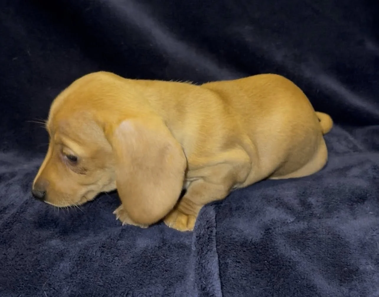 Rodeo & Choux pupsborn 1/25/26Miniature Dachshunds, AKC registered Short hair light red black nosed female. Long hair light red female. Short hair Isabella (gray) female. Long hair dark red female with small patch of dapple on back. Short hair light red liver nosed female.